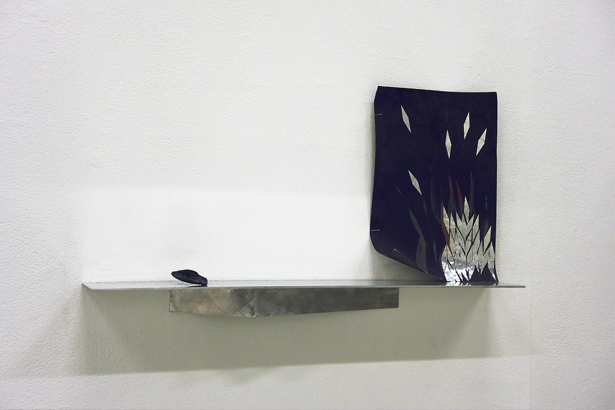 Fire in Me. Aluminium, paper, aluminium foil, plaster, colour pencil, nail polish, pins, black tack, W 75 x D 10 x H 34 cm